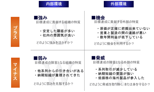 | SWOT分析とは、戦略立案する際に使われる分析手法です。 企業の外部環境から 機会(O=opportunities) 脅威(T=threats) 企業が持っている内部環境から 強み(S=strong) 弱み(W=weaknesses) 上記の4つの切り口から分析し、事業戦略を立案いたします。 企業では、企業・事業戦略に意識が向いてしまうことが多いのですが、SWOT分析は走っていては分からない点に気づかせてくれることがあります。 |