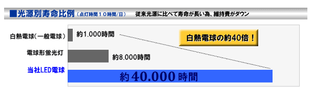 | LED照明器具の光源の寿命はLEDモジュールの寿命のことです。(社)日本照明器具工業会にて2010年7月に改正された「JIL5006:白色LED照明器具性能要求事項」の中で、一般照明用途に用いられる白色LEDモジュールの寿命の定義は“照明器具製造業者が規定する条件で点灯したとき、LEDモジュールが点灯しなくなるまでの総点灯時間または、全光束が点灯初期に計測した値の70%に下がるまでの総点灯時間のいずれか短い時間を推定したもの”と規定されました。(ただし、この定義は表示または装飾の用途には適用しないため、カラーLEDは従来どおり「光束維持率50%」を寿命としています。) |