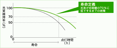 | 当社では、「JIL5006:白色LED照明器具性能要求事項」に従い、LEDモジュールの寿命を推定しています。なお、これらはあくまで設計寿命であり、この寿命を保証するものではありません。また、LEDモジュールとしての寿命であり、照明器具としての寿命は他の光源を使用した器具の場合と同様の考え方になります。 |