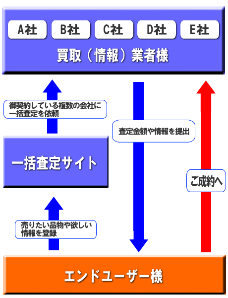 | 売りたいものを1万円でも高く買取りしてもらうためには、 1店でも多くの買取り業者に査定してもらうことが大切です。 そして、各業者が出してくれた査定額を比較検討し、 1番高く査定してくれた業者に 買い取ってもらうことで、 あなたの売りたいものを1万円でも高く売ることができます。 しかし、 何度も何度も色々な買取り店に持ち込み、 査定をお願いするというのは、 時間と手間、さらには時としてお金がかかり、 とても大変です。 そこでおすすめなのが、 無料一括査定サイトを利用することです。 |